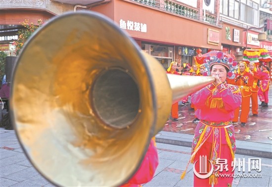 當表演隊伍敲鑼打鼓經(jīng)過一家繡品店時,在這里開店38年的老板王先生和老伴站在店門口喜笑顏開,看著這熱鬧場面,王老板轉(zhuǎn)頭和老伴感嘆:“好多年沒有這么熱鬧了!”(東南早報記者 林福龍 陳玲紅/文 莊麗祥/圖)