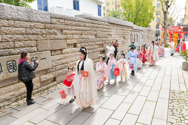 巡游盛典同時(shí)開啟,大小朋友身著廣袖襦裙,頭梳古韻發(fā)型,手提元宵燈,在魁龍坊曲裾輕舞,為游客呈現(xiàn)一場古韻十足的視覺盛宴。