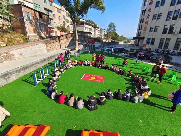 活動(dòng)中,首先劉聰娣通過(guò)新年手指操、“刮大風(fēng)”熱身活動(dòng),調(diào)動(dòng)孩子們的積極性,放松孩子們的心情,活躍氣氛。隨后圍繞“青春展示、青春集結(jié)、青春自護(hù)” 主題將孩子們分為三組,開展了 “大紅燈籠高高掛”“按序出牌翻翻轉(zhuǎn)”“報(bào)紙運(yùn)球不落地”小組團(tuán)結(jié)活動(dòng),緩解隊(duì)員之間的陌生感,增加信任感,分享青春自護(hù)故事。最后劉聰娣帶領(lǐng)孩子們到戶外開展手語(yǔ)歌、拔河比賽、搶凳子游戲活動(dòng),熱烈、興奮、緊張、快樂(lè)的活動(dòng)讓孩子們放松了心情。