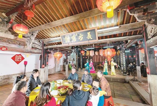 在龍海區(qū)埭古村前祠堂,一家人圍坐一起吃團(tuán)圓飯、看薌劇,其樂融融。漳州文明網(wǎng)供圖