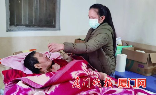 蔡秋菊給婆婆喂飯。 戴舒靜 攝