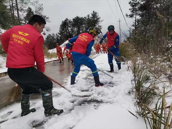 文明風(fēng)2月21日訊 2月19日晚,福安市曉陽(yáng)鎮(zhèn)迎來(lái)了2022年的第一場(chǎng)雪,雪景吸引眾多游客們前來(lái)打卡拍照。然而,路面積雪帶來(lái)了極大的道路交通安全隱患,為及時(shí)消除極端天氣帶來(lái)的影響,2月20日,福安市曉陽(yáng)鎮(zhèn)路長(zhǎng)辦、道安辦、派出所、福安市藍(lán)天救援隊(duì)曉陽(yáng)中隊(duì)等多個(gè)部門組織志愿者開展“破冰行動(dòng)”。