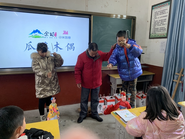 將樂(lè)縣非遺傳承人肖裕良老師在教授余坊中心校的孩子們操作木偶戲。