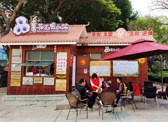 “‘薯花文明小站’以惠安縣廣大市民群眾熟悉的薯花為原型,突出‘接地氣、干實事、惠民生、樹形象’的創(chuàng)建特色,致力打造成為惠安縣公共服務的便民窗口、城市形象的推廣中心、志愿服務的微笑名片、奉獻愛心的集散平臺。”惠安縣委文明辦相關負責人介紹。