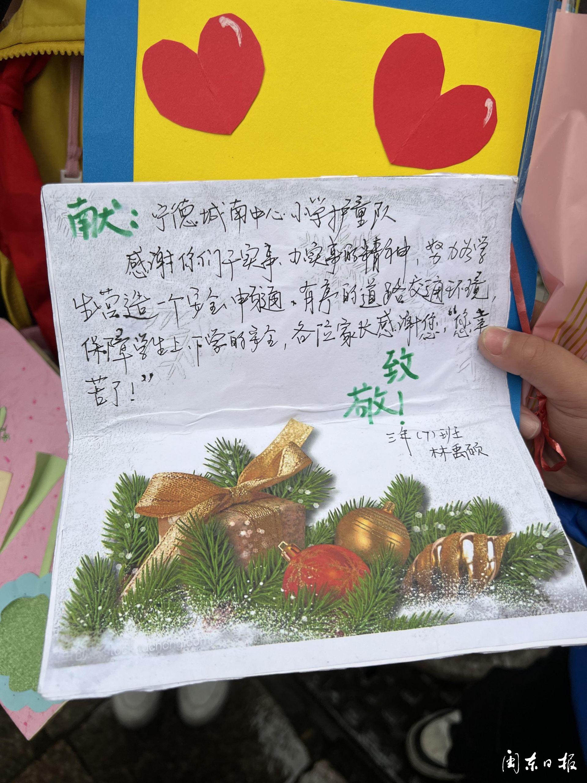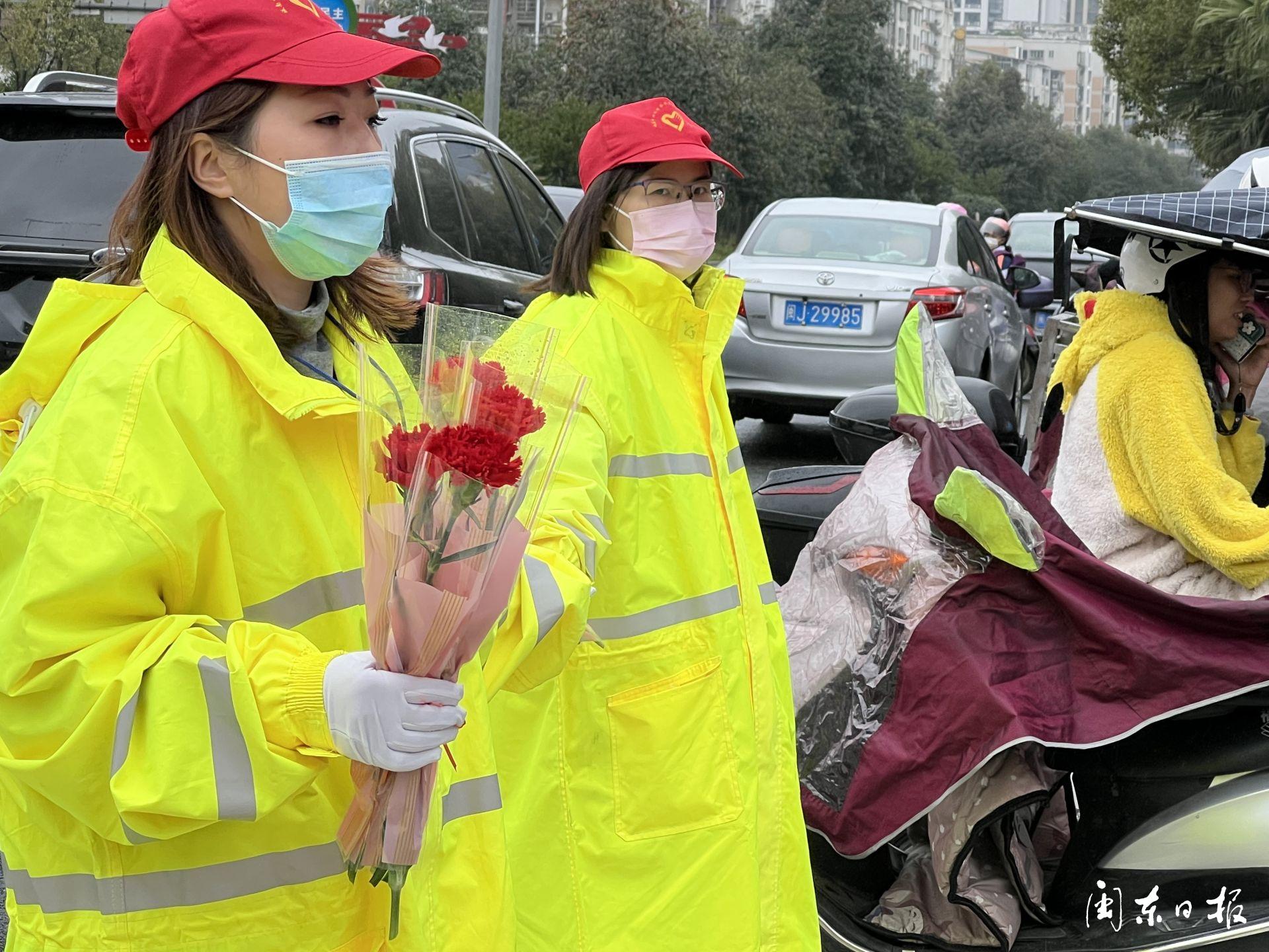 3月7日上午,放學(xué)鈴聲響起,蕉城區(qū)城南中心小學(xué)三年七班的孩子們排著隊,手握鮮花和賀卡來到校門口,為正在執(zhí)勤的護(hù)童隊家長們,送上“三八”婦女節(jié)的禮物。