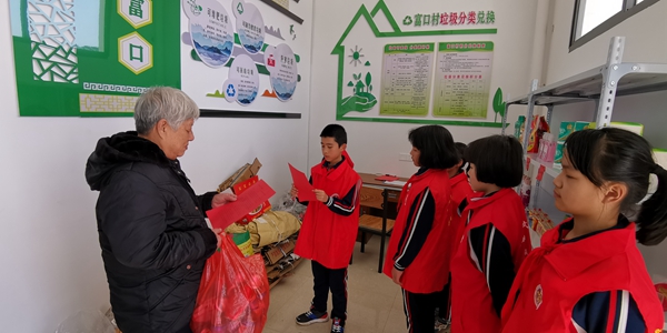 富口鎮(zhèn)鄉(xiāng)村“復(fù)興少年宮”同學(xué)在富口村環(huán)保小站擔(dān)任環(huán)保小衛(wèi)士向老人宣傳垃圾分類知識(shí)。沙縣區(qū)委文明辦供圖