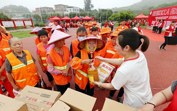 志愿者向529名環(huán)衛(wèi)工人送去愛(ài)心大禮包、送義診送健康和免費(fèi)理發(fā)等貼心服務(wù)。