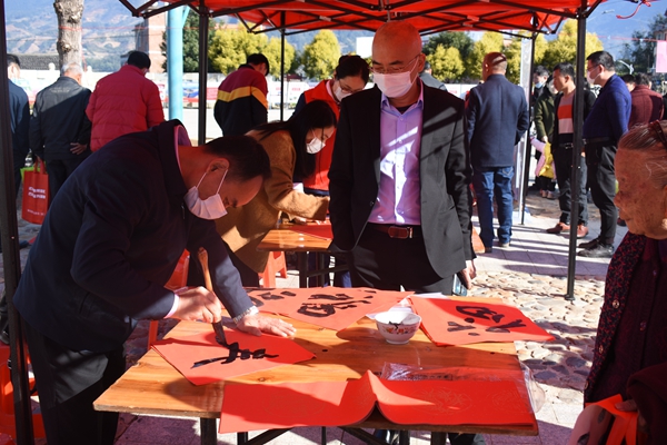 華安縣仙都鎮(zhèn)大地村新時(shí)代文明實(shí)踐站“三下鄉(xiāng)”集中服務(wù),書(shū)法協(xié)會(huì)志愿者為群眾書(shū)寫(xiě)春聯(lián)