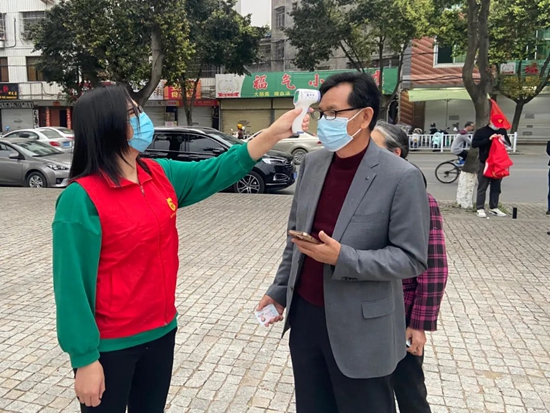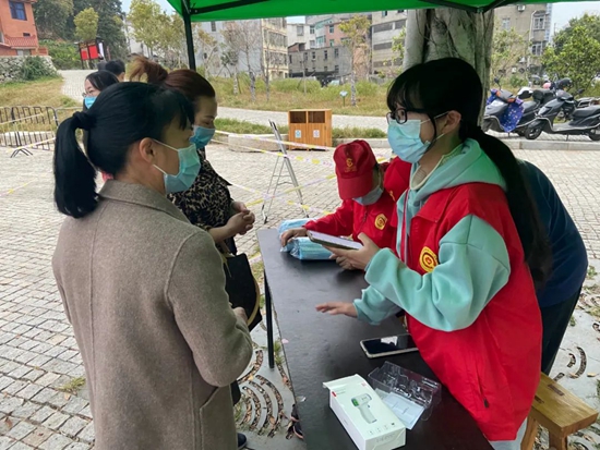 3月15日清晨,志愿者為群眾測量體溫,等待采樣(徐泳堃 攝)