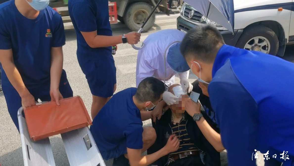 在等待過程中,消防救援人員對老人的傷口進行包扎止血,并清理老人面部血污。同時撐傘為老人遮陽,避免因太陽直射致老人悶熱眩暈,進而導致傷情加重。