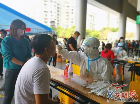 醫(yī)護(hù)人員耐心地引導(dǎo)居民進(jìn)行核酸采樣(翔安區(qū)委文明辦供圖)