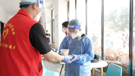 “為保證餐飲安全,便當(dāng)從食材采購到烹飪裝配,再到現(xiàn)場分發(fā),每個(gè)流程都進(jìn)行了嚴(yán)格的檢測或消毒,確保第一時(shí)間將新鮮熱乎的飯菜送到一線防疫工作人員的手中?!眹矏坌谋惝?dāng)負(fù)責(zé)人彭康政說道。
