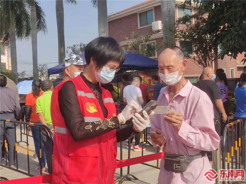 雙嶺村新時(shí)代文明實(shí)踐站社工陳秀治在核酸采樣點(diǎn)幫助群眾完成信息登記。(集美區(qū)新時(shí)代文明實(shí)踐中心供圖)