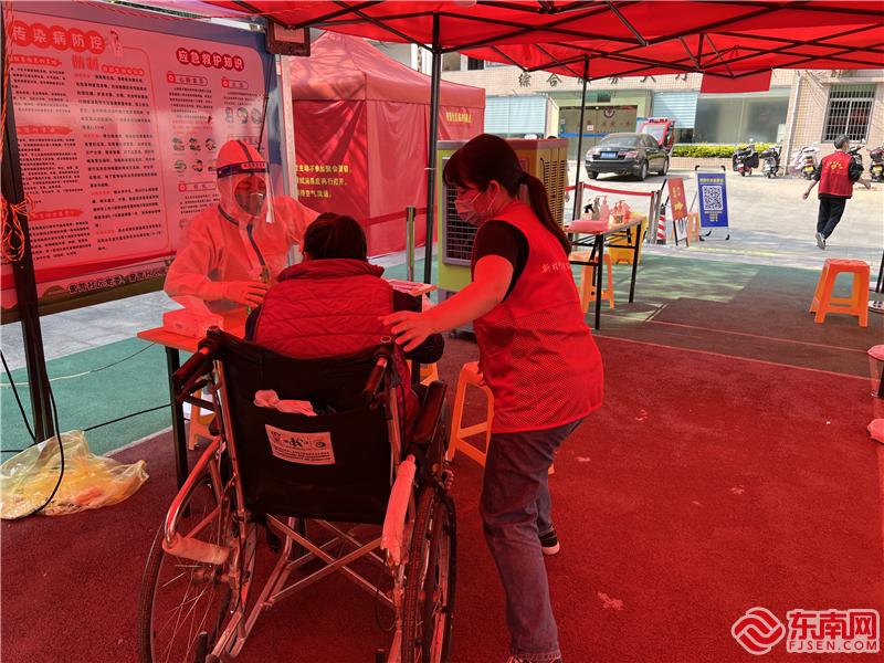 曾營(yíng)社區(qū)新時(shí)代文明實(shí)踐站社工協(xié)助核酸采樣。(集美區(qū)新時(shí)代文明實(shí)踐中心供圖)
