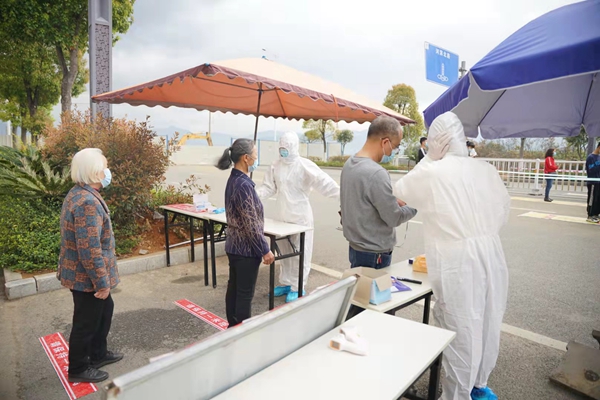 “請(qǐng)大家有序排隊(duì),保持一米距離!”“老人家,我來(lái)幫您預(yù)約登記!”志愿者們?cè)诤怂釞z測(cè)點(diǎn),耐心提醒著前來(lái)檢測(cè)的居民,為不會(huì)使用智能機(jī)的老人掃碼登記。盡管只是簡(jiǎn)簡(jiǎn)單單的幾句話,但每位志愿者們?nèi)匀徊恢v地重復(fù)上百遍。