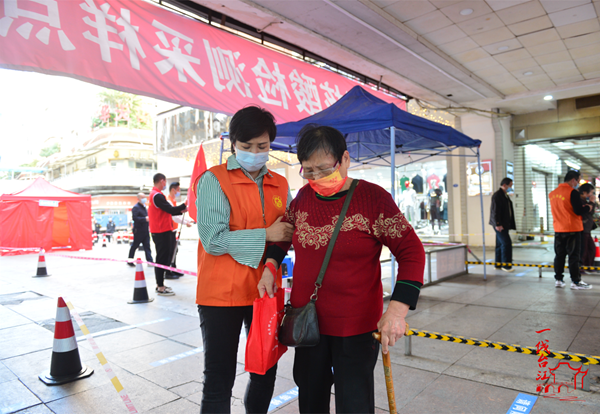 3月20日,在中亭街核酸檢測采樣點(diǎn),陳美珠(左一)在給行動(dòng)不便的居民排憂解難(葉誠 攝)