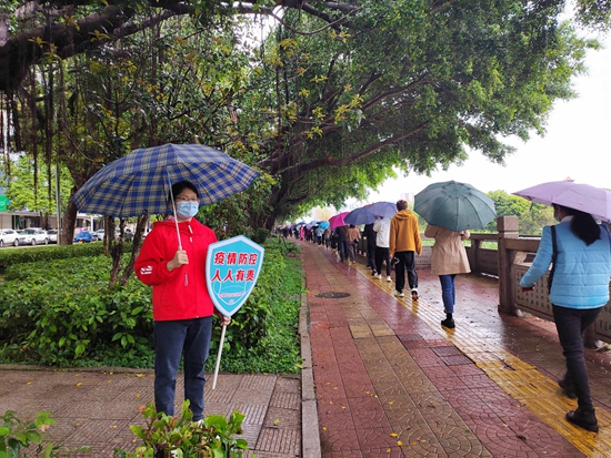 “今天是第一次參加核酸檢測志愿服務(wù),前些天跟同事參加過疫情防控宣傳活動,疫情之下,需要我們每個志愿者勇敢站出來,為家鄉(xiāng)出一份力?!卑蚕ㄐ兄驹刚咧x月治到城東社區(qū)參加志愿服務(wù),主要工作是參與現(xiàn)場秩序維護,掃碼測溫等,她說雖然遇到下雨天,但大家都很配合,整個核酸采樣過程非常順利高效。