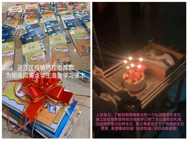 “謝謝叔叔阿姨,你們辛苦了”...在涵江區(qū)明珠酒店隔離點,入駐首日錄入信息時發(fā)現(xiàn)有1名仙游籍學(xué)生生日,駐點志愿者們立即聯(lián)系為該同學(xué)送上生日蛋糕與生日禮物,與他一同慶祝生日??紤]到隔離點的學(xué)生需要學(xué)習(xí),隔離組工作人員馬上聯(lián)系書店準(zhǔn)備了一批教材,由專門人員發(fā)放給每位學(xué)生。送愛心禮物,傳遞人文關(guān)懷,增添溫度與信心,做細(xì)做實隔離轉(zhuǎn)運(yùn)專班“為民服務(wù)”工作的具體實踐。