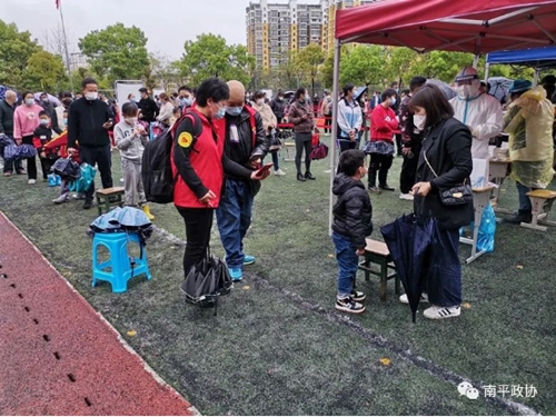 南平市政協(xié)機(jī)關(guān)疫情防控應(yīng)急援助機(jī)動隊(duì)小分隊(duì)志愿者下沉曼山小學(xué)采樣點(diǎn)。黎彪 攝