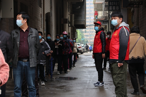 志愿者維護(hù)核酸檢測(cè)現(xiàn)場(chǎng)秩序(長(zhǎng)樂區(qū)委文明辦供圖)