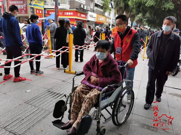 志愿者幫助行動不便的老人通過綠色通道快速檢測(方子洲 翁旺燈 陳阜 葉誠 攝)