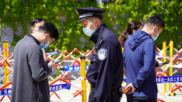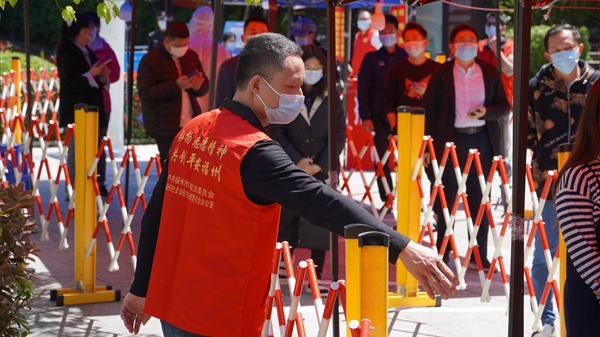 退役軍人化身防疫志愿者幫助居民掃碼(鼓樓區(qū)委文明辦供圖)
