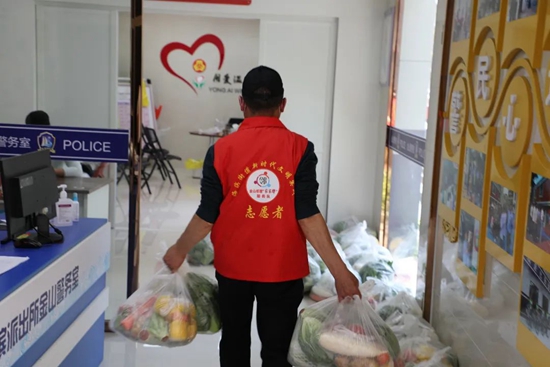志愿者為居民送菜。許培吟 供圖