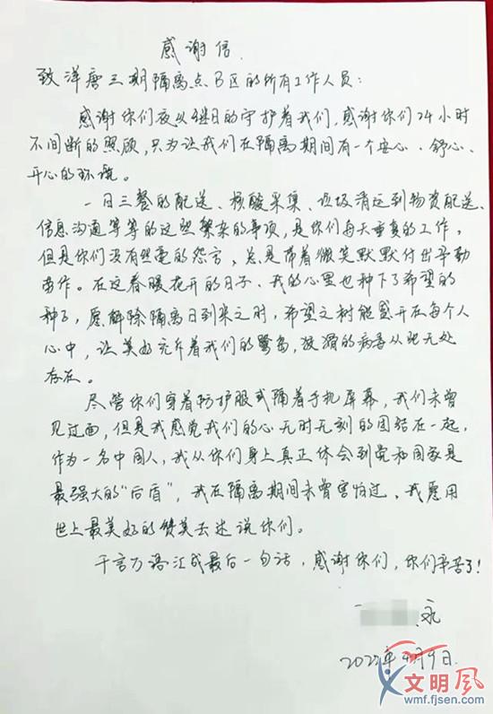 文明風4月12日訊(夏菁 王廣春)4月9日19點23分,廈門翔安區(qū)洋唐三期封控點B區(qū)的工作人員收到了一封來自封控點醫(yī)學留觀人員狄先生的手寫感謝信。