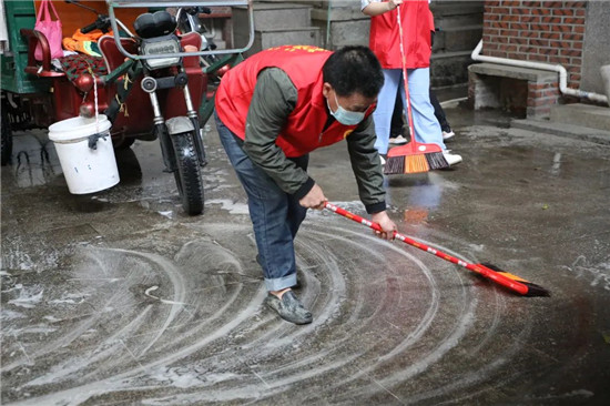 社區(qū)工作人員與居民一起清洗地板。臨江街道供圖
