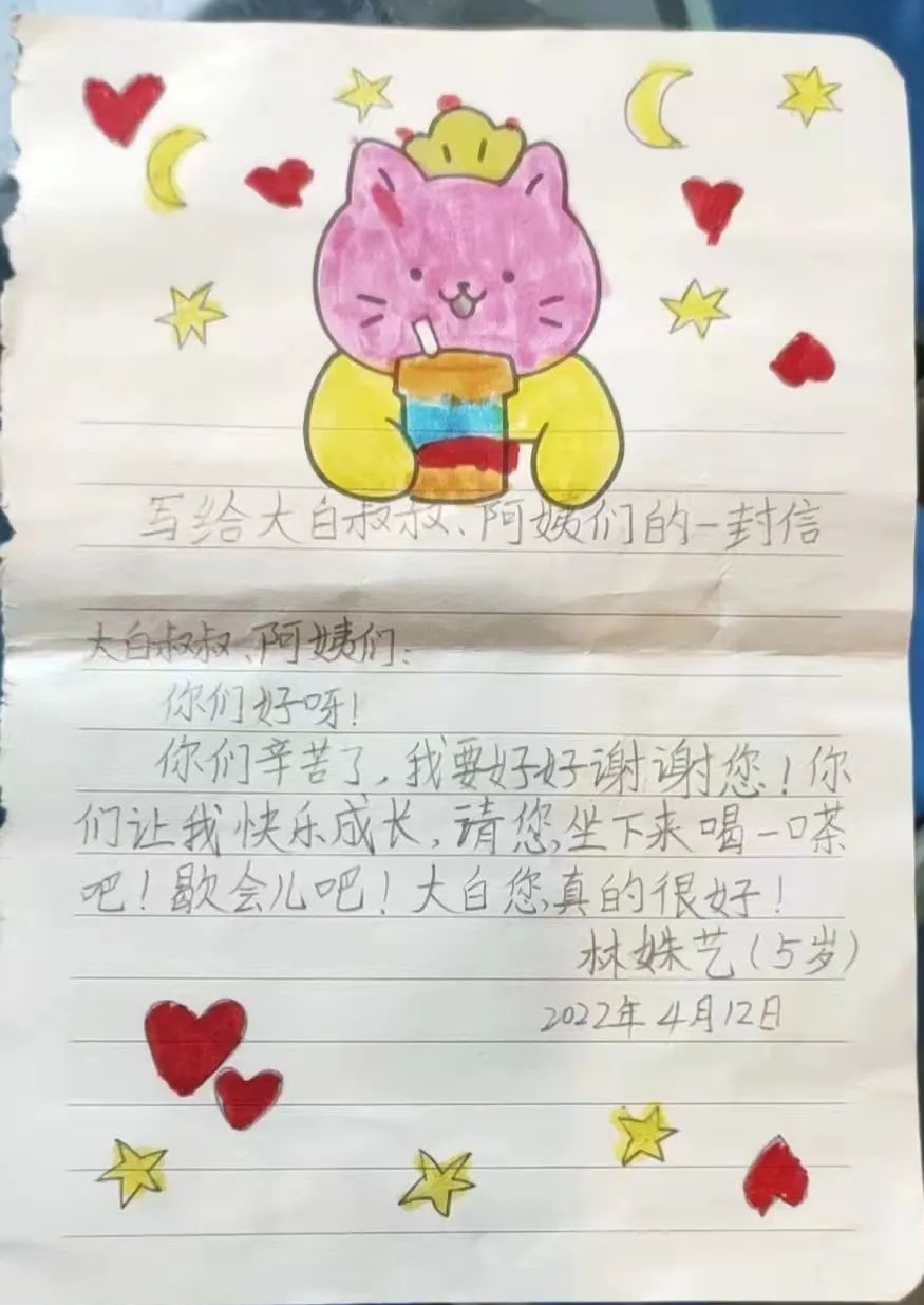 “大白叔叔,大白阿姨,可以請(qǐng)你們過來一下嗎?”4月14日,一聲稚嫩的聲音打破了伯爵酈城值守點(diǎn)內(nèi)緊張的氛圍,一名小女孩用力揮舞著手中的信封,向工作人員打招呼?!斑@是我給你們寫的信,你們一定要看哦!”女孩鄭重地將信遞到了工作人員手中,然后蹦跳著離開了。