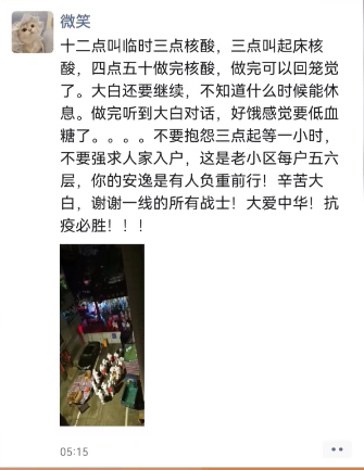 “感謝黨和政府及愛心人士,感謝社區(qū)工作者和志愿者”“物資已領(lǐng)!感謝駐守的每一位志愿者,謝謝你們!”“春天的夜很涼,但看到你們,心里很暖!”“你的安逸是有人負(fù)重前行,謝謝一線所有抗疫戰(zhàn)士,大愛中華,戰(zhàn)疫必勝”......連日來,一條條感謝的信息,刷滿社區(qū)的業(yè)主群。
