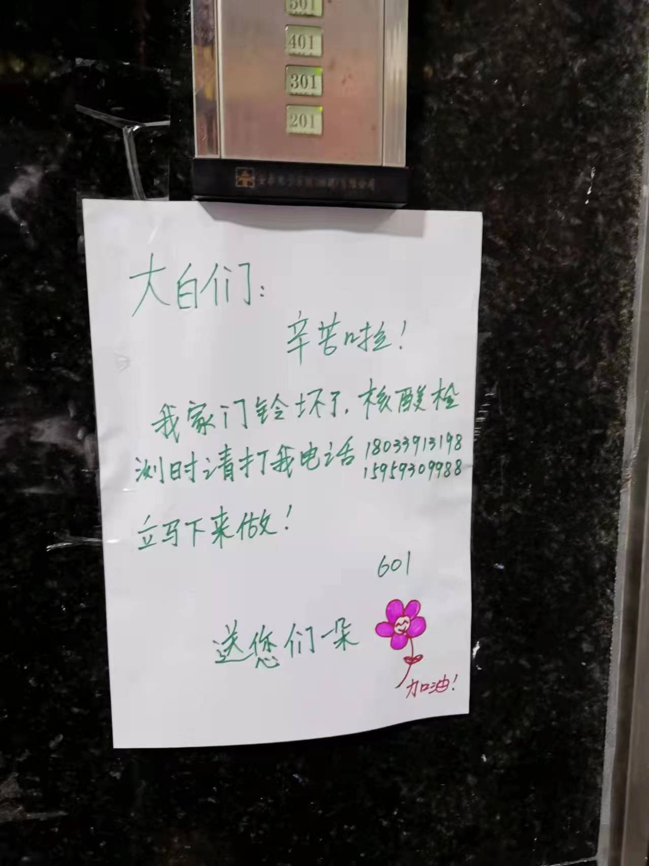 “感謝大白們的辛苦付出,比心”“致敬!我們的抗疫勇士”“春可期,疫可除,人團(tuán)圓、共平安”......這是荷園新村里業(yè)主們貼在門上的感謝,城建集團(tuán)的志愿者們貼心到位的服務(wù),讓群眾深受感動。