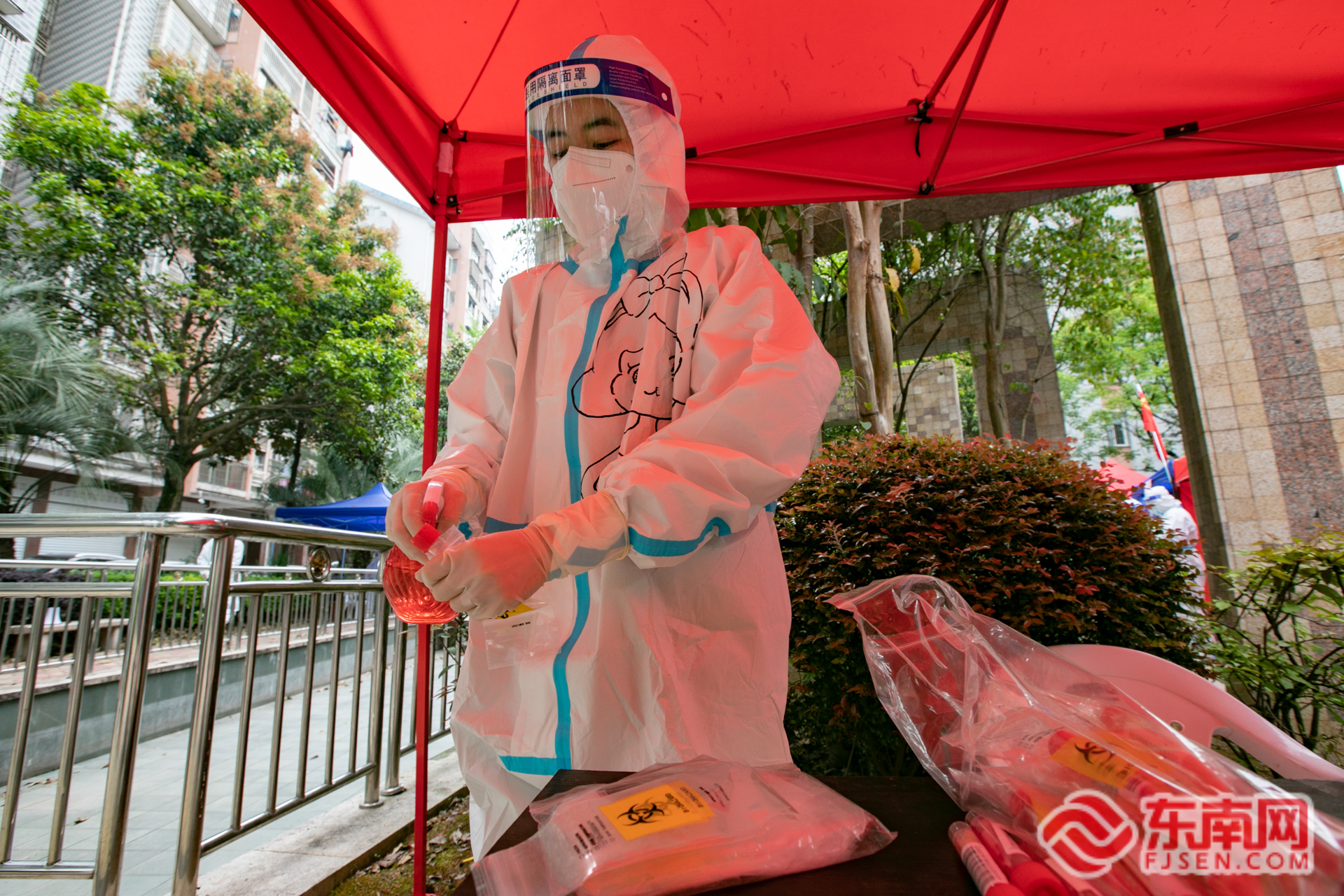 穿防護服,整理試管、取樣器、開箱碼、試管碼、酒精消殺……20日凌晨五點,天微微亮,寧德東僑社區(qū)網(wǎng)格員林美薇便已經(jīng)在怡和麗景小區(qū)臨時核酸檢測點忙碌開了。