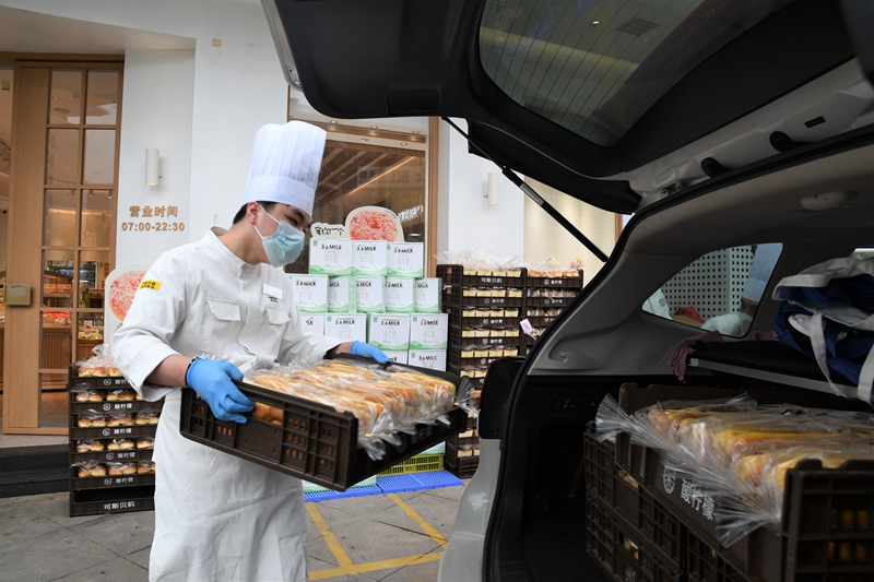 可斯貝莉現(xiàn)烤面包店將愛心物資裝車