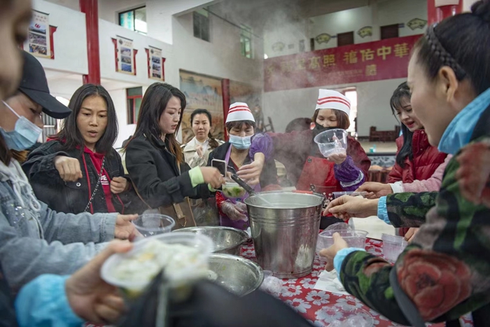 熱鍋下油,放入蝦、海蠣以及鮑魚肉,鏟米漿,合蓋掀蓋連續(xù)數(shù)次......“大廚們”熟練地操作著制作鍋邊的步驟,待米漿變成卷卷的米漿片,撒上蔥花和蒜葉,一碗新鮮鮑魚鍋邊就出爐了。 鍋邊的香氣順著窗戶飄到馬路邊,一波又一波食客尋味而來,廚師們現(xiàn)炒,“吃貨”們現(xiàn)吃,看到如此熱鬧的場景,大家紛紛拿出手機拍攝,將現(xiàn)場歡慶的氛圍傳遞給更多的人。不遠處的廣場上,連江文藝輕騎兵、麗人行等演員們冒雨演出,為十里八鄉(xiāng)的村民們奉上精彩的文藝大餐,在觀眾熱烈的叫好聲中,好戲接連登場。