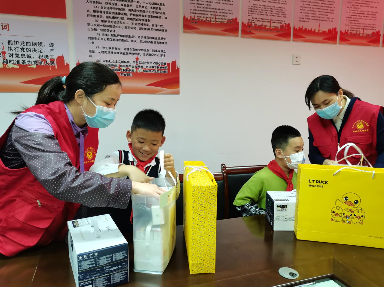 志愿者為留守兒童送去牛奶、文具等生活用和學(xué)習(xí)用品。陳美嬌 攝