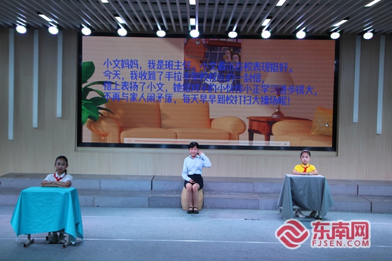 “母親節(jié)快到了,該送什么禮物呢?”“給你媽媽洗腳吧!”舞臺上,來自泉州市通政中心小學四年段戲劇社的學生帶來音樂劇《同一片藍天下》,兩個小女孩通過視頻連線,你一言我一語地訴說著彼此的心事,很是親密。