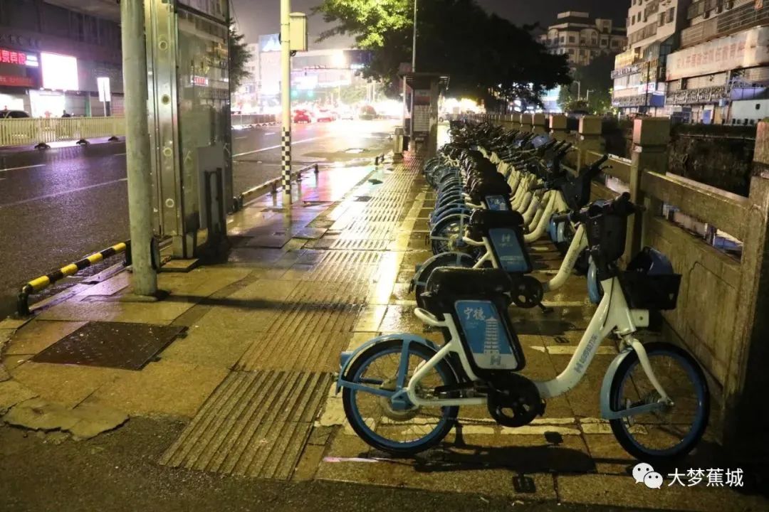 共享單車、電動車整齊排放,地面光潔如新,道路寬敞通暢,漫步在夜間的東湖路,一幅安靜祥和的美好夜景。