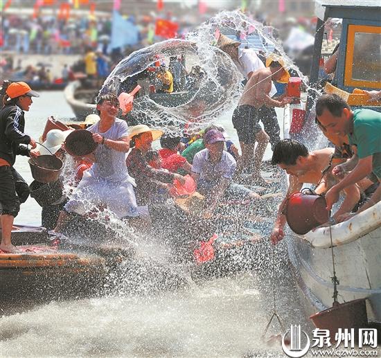 石獅市蚶江鎮(zhèn)的海上潑水民俗活動(dòng),是國(guó)內(nèi)唯一海上潑水節(jié),至今已傳承了200多年,成為一種別具特色的閩臺(tái)對(duì)渡文化習(xí)俗,入選第三批國(guó)家級(jí)非遺名錄。自古以來(lái),蚶江與臺(tái)灣彰化鹿港商貿(mào)往來(lái)頻繁,因此有著密切的對(duì)渡往來(lái),競(jìng)舟潑水是蚶江與臺(tái)灣鹿港人端午節(jié)的特殊風(fēng)俗。近年來(lái),蚶江和鹿港同胞一起將其演變成為富有閩南特色的“海上潑水節(jié)”盛大活動(dòng)。每逢端午節(jié),兩岸對(duì)渡的船只都要在蚶江海邊追逐潑水,上百艘船揚(yáng)帆出海,一起在海上演繹激情水戰(zhàn),交融情誼,并祈求平安興旺。