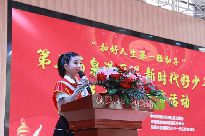 “作為新時代中國特色社會主義事業(yè)的接班人,崇德修身,扣好人生第一??圩?,既是我們的承諾,也是我們的責任。在此,我向全區(qū)中小學生倡議做一名踐行社會主義核心價值觀、弘揚中華優(yōu)秀傳統(tǒng)文化、傳承紅色基因、積極參加社會實踐、傳播雷鋒精神的新時代好少年。”現(xiàn)場,益海實驗小學黃湛雯同學代表第三屆泉港區(qū)“新時代好少年”宣讀倡議書。