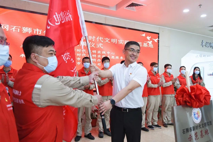 在活動(dòng)現(xiàn)場(chǎng),石獅市委宣傳部副部長(zhǎng)、文明辦主任蔡振宇,文明辦副主任黃雅霜,國(guó)網(wǎng)泉州供電公司黨建部主任陳建斌,國(guó)網(wǎng)石獅市供電公司黨委書(shū)記、副總經(jīng)理陳建平共同為示范基地揭牌。國(guó)網(wǎng)石獅市供電公司紀(jì)委書(shū)記、工會(huì)主席蘇軍毅主持儀式,10支共產(chǎn)黨員服務(wù)隊(duì)、志愿服務(wù)隊(duì)代表參加活動(dòng)并接受授旗。