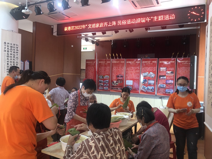 泉港區(qū)2022年“ 文明家庭齊上陣 民俗活動(dòng)迎端午”主題活動(dòng)現(xiàn)場(chǎng)包粽子(泉港區(qū)委文明辦供圖)
