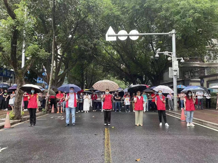 6月7日,高考首日,暴雨也隨考試一起“上線”。屏東中學(xué)門(mén)口路段,海峽姐妹雜志社黨員志愿突擊隊(duì)響應(yīng)共建單位樹(shù)兜社區(qū)的志愿征集令全員出動(dòng),與考生同“赴考”,全力為高考“保駕護(hù)航”。在學(xué)校門(mén)口進(jìn)行動(dòng)態(tài)化巡邏、查看周邊道路情況、協(xié)助維護(hù)公共秩序,遇到誤行駛至該路段的車(chē)輛,引導(dǎo)分散聚集的家長(zhǎng)們讓車(chē)輛順利繞道。第一場(chǎng)考試結(jié)束,有不少考生忘帶雨具,雜志社全體黨員志愿者立即化身“移動(dòng)遮雨棚”,一路撐傘“護(hù)送”考生與家長(zhǎng)匯合。