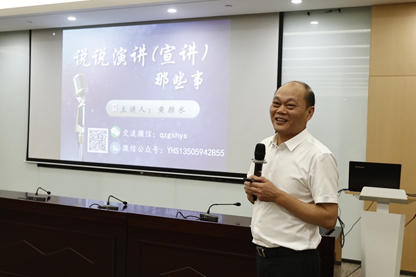 講座邀請(qǐng)泉州市演講與口才學(xué)會(huì)副會(huì)長(zhǎng)兼秘書長(zhǎng)、泉州演講達(dá)人黃顏水到場(chǎng)授課。黃顏水老師以《說說演講那些事》,從什么是演講、別出新意的方法、演講高潮的設(shè)計(jì)、演講技巧的運(yùn)用等四個(gè)方面向?qū)W員們進(jìn)行賽前指導(dǎo),生動(dòng)形象地解析了演講的概念、演講稿的寫作和演講的技巧。
