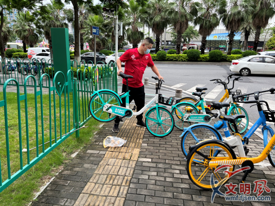 志愿者規(guī)整共享單車(chē)停放(金山街道供圖)