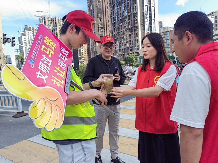 志愿者為創(chuàng)城一線工作者送去綠豆湯。江鵬攝