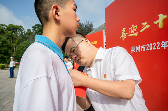 與會(huì)的領(lǐng)導(dǎo)為新團(tuán)員代表佩戴團(tuán)徽。洪燕翎 供圖