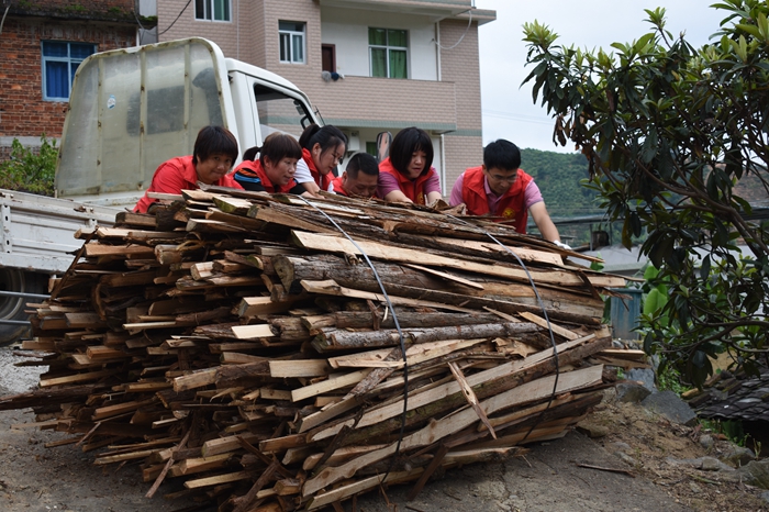 詹玉嬌與臻善愛心公益組織的志愿者們一同將柴火捆好,并把一摞摞柴火搬到老人家門口