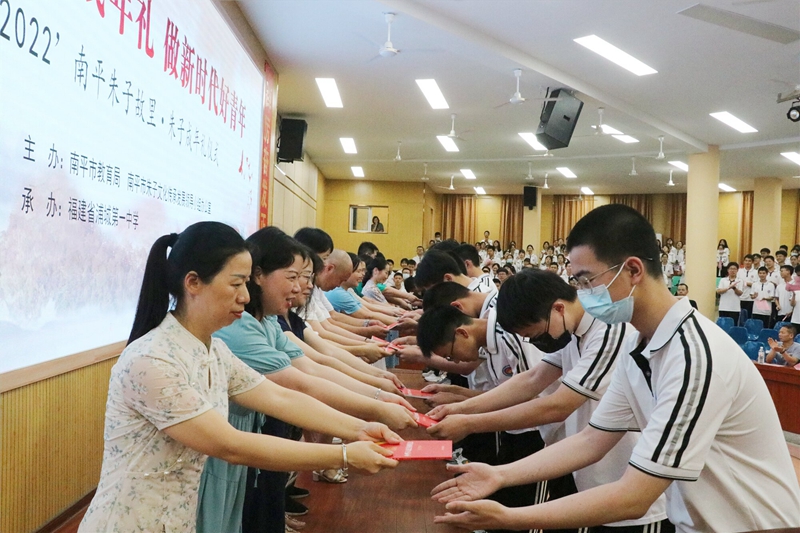 在浦城一中圖書館報(bào)告廳,近700名學(xué)子身著統(tǒng)一校服,鏗鏘有力地誦讀誓詞,立志傳承文明、振興中華。儀式上,師生同唱國(guó)歌,家長(zhǎng)、老師們表達(dá)了對(duì)青年學(xué)子的美好祝愿,鼓勵(lì)他們奮發(fā)向上,學(xué)生集體向家長(zhǎng)、老師、朱子畫像行三鞠躬禮,感恩父母,感謝師長(zhǎng),禮敬朱子,并立志傳承文明、振興中華,場(chǎng)面熱烈而感人。