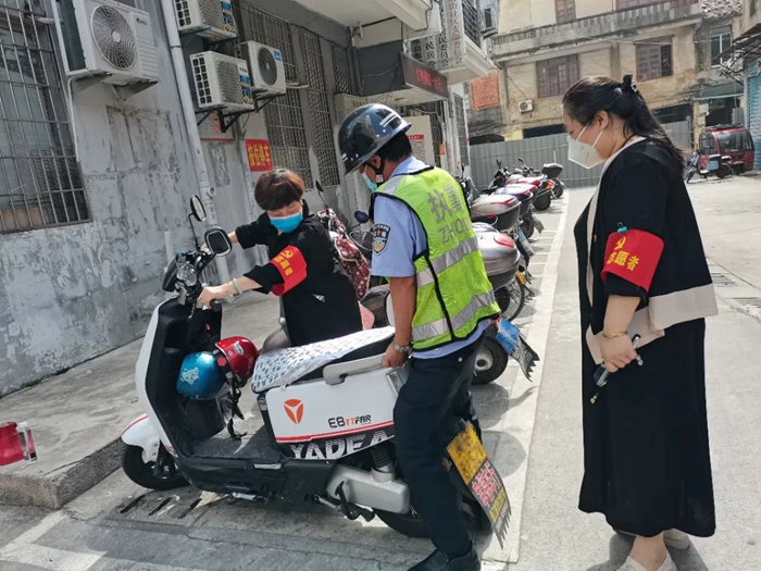 社區(qū)網(wǎng)格長帶隊(duì)巡查,規(guī)范車輛停放秩序。涵江區(qū)委文明辦供圖